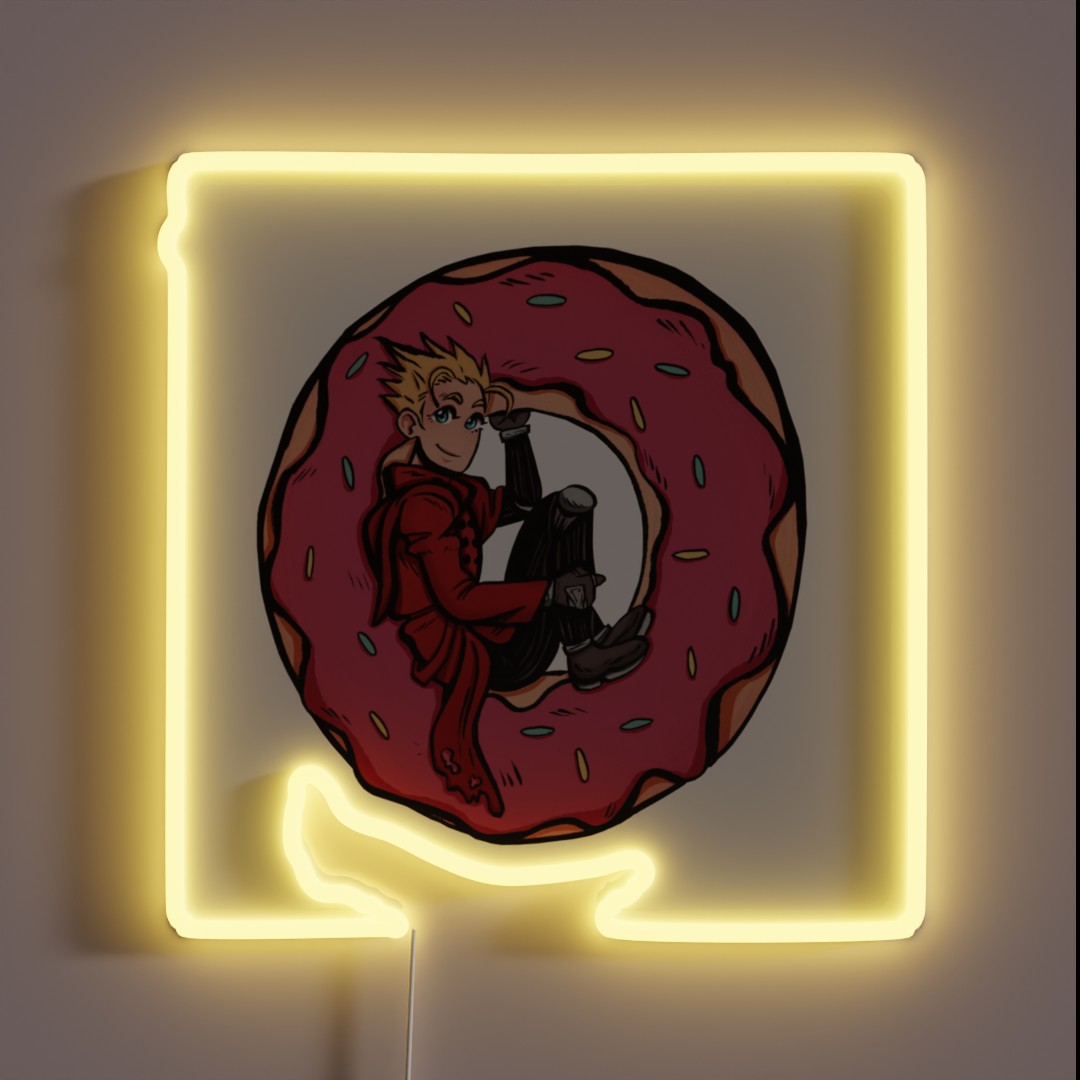 Add a pop of color to your gaming setup with our customizable Doughnut Vash RGB neon sign, featuring vibrant LED lights and a sleek design inspired by your favorite anime character.
