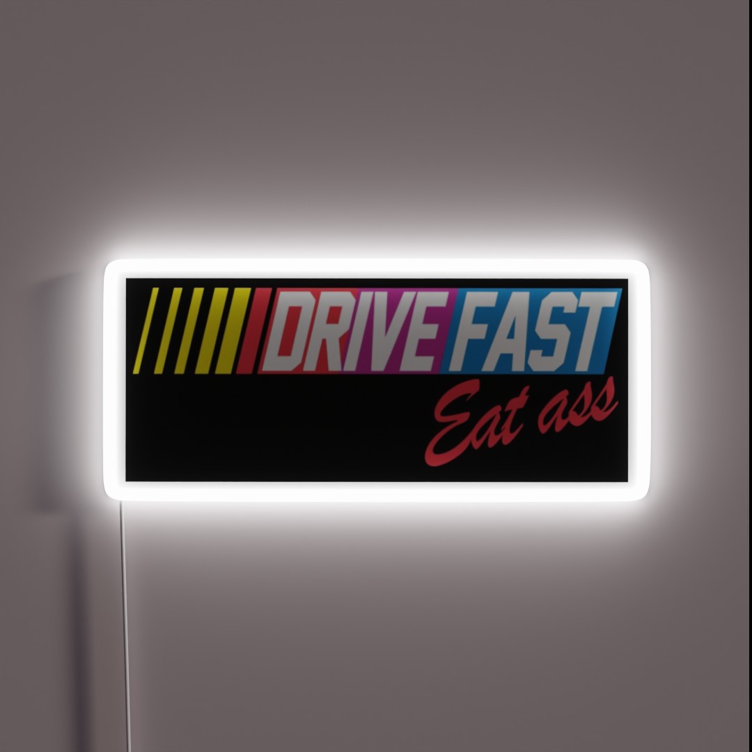 A vibrant and bold neon sign featuring eye-catching RGB lighting that reads ‘Drive Fast Eat Ass’ – perfect for car enthusiasts and thrill-seekers who live life on the edge.