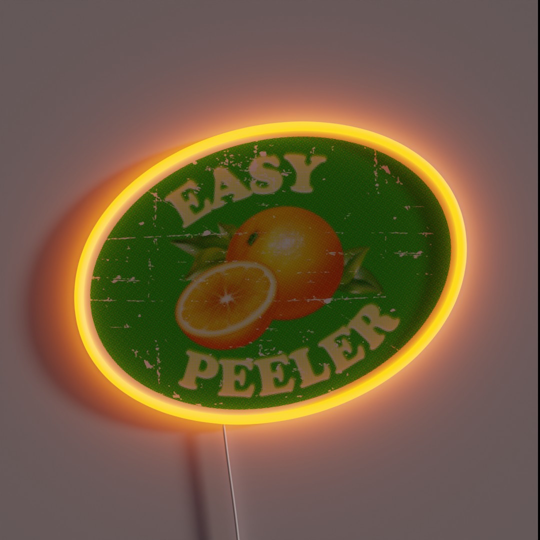 The 12V adapter ensures safe and easy installation, making it simple to hang the sign anywhere in your home or business. The EASY PEELER distressed vintage cheeky orange satsuma clementine fruit label RGB neon sign is perfect for adding a pop of color and personality to any room, while also serving as a fun reminder about the importance of easy peeling fruits!