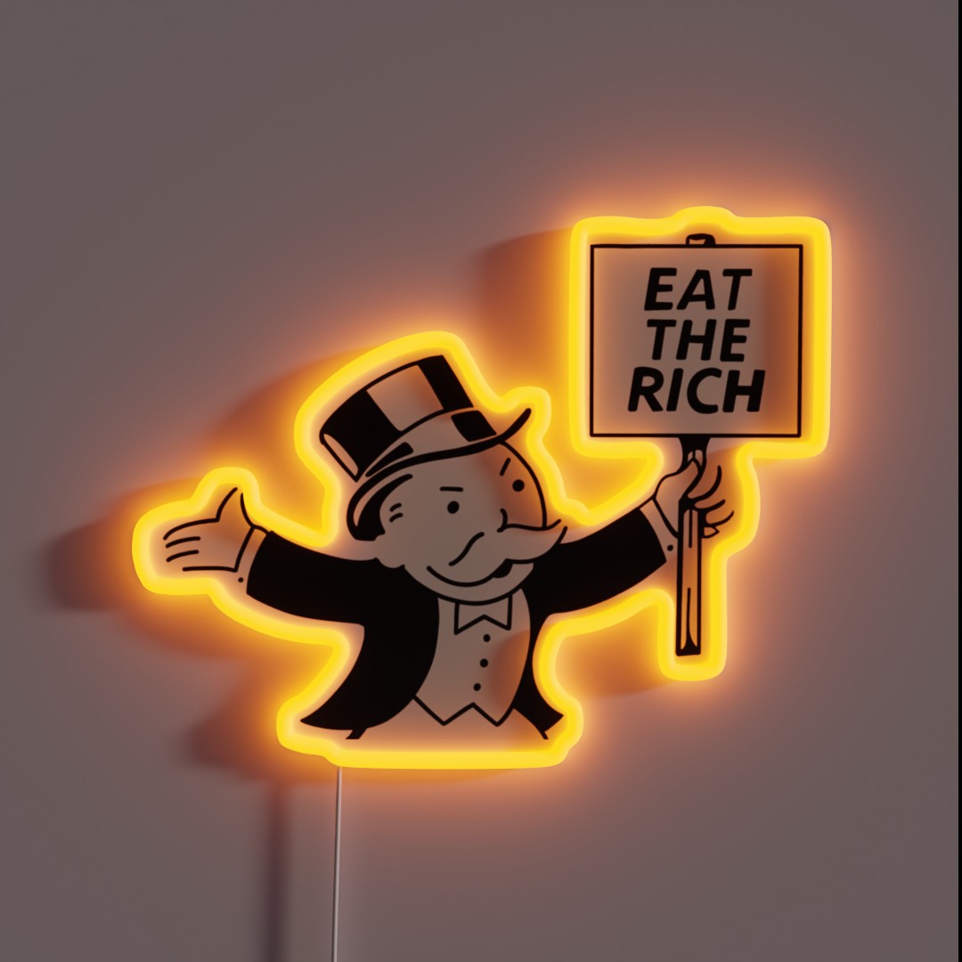 Elevate your space with this bold, neon-lit twist on the classic Monopoly mascot, reimagined as ‘Eat the Rich’ – a humorous statement piece that makes a powerful social commentary.