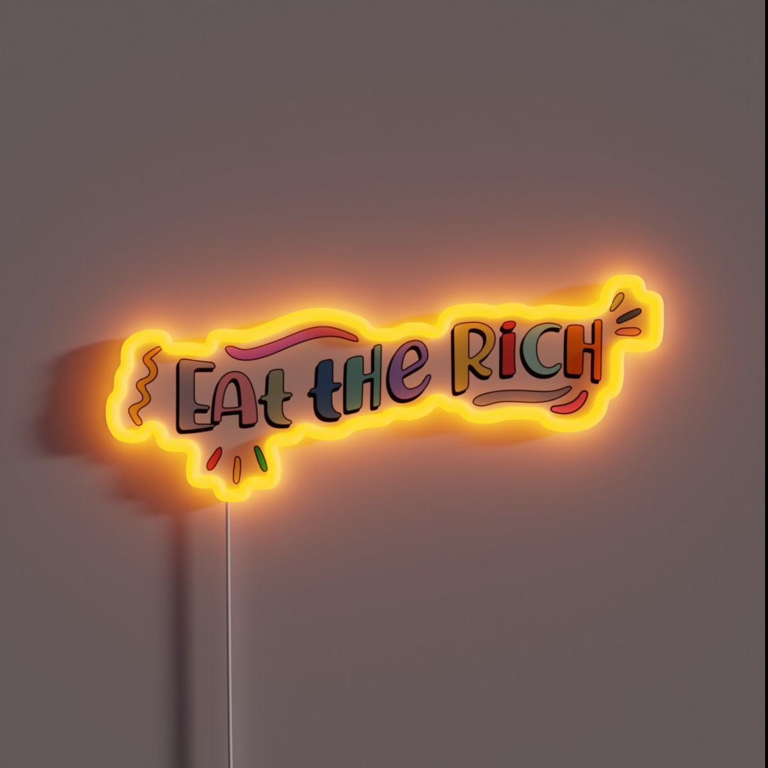 Make a bold statement with our Eat The Rich retro typography RGB neon sign, inspired by the rebellious spirit of the past. This eye-catching sign is designed for those who refuse to conform and demand change.