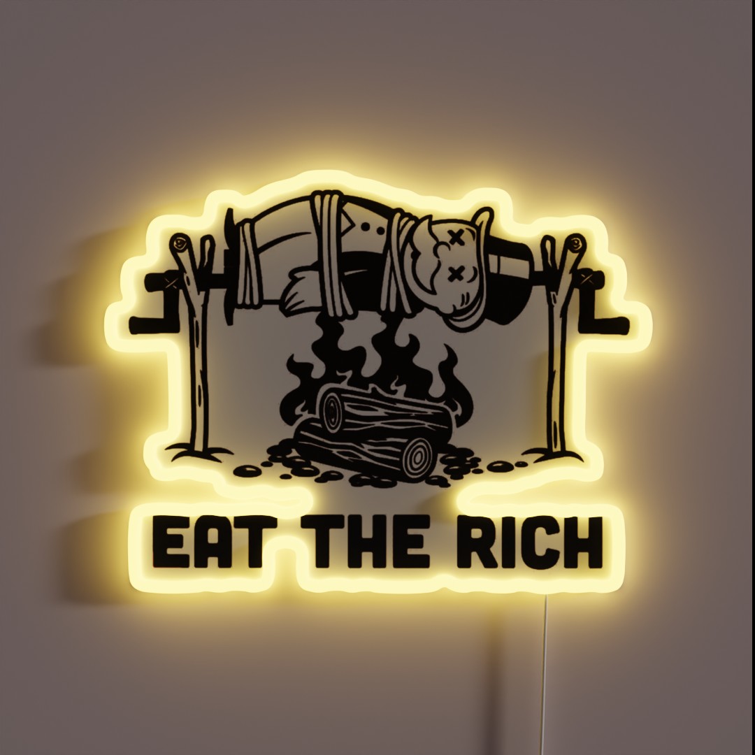 Brighten up your space with the provocative ‘Eat the Rich’ RGB neon sign, a bold statement piece perfect for those who dare to challenge societal norms.