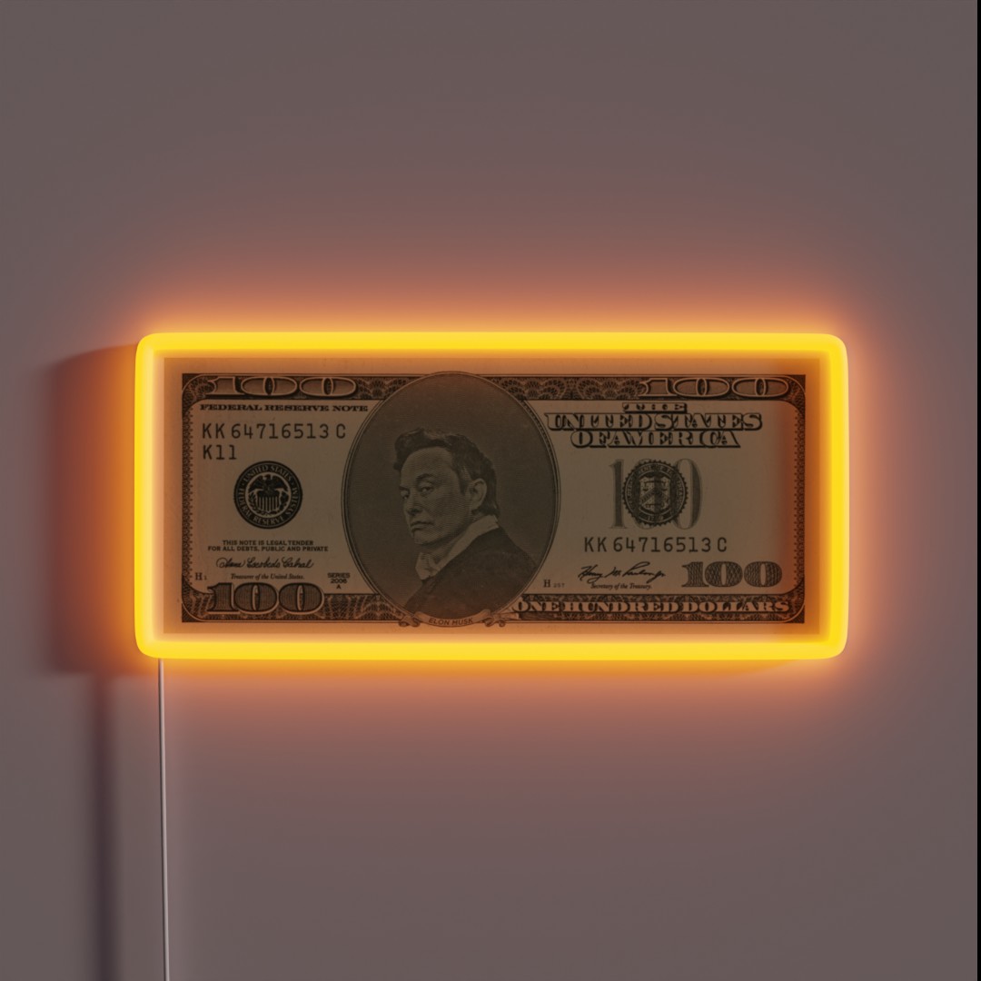 Add a touch of futuristic flair to your space with this unique LED neon sign featuring an image of Elon Musk on a $100 bill in vibrant RGB colors.