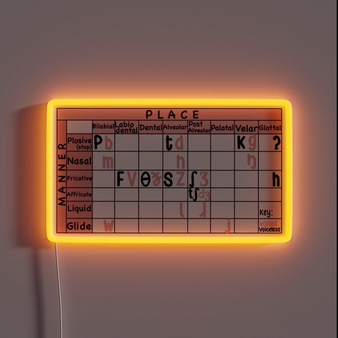 Bring the world of linguistics to life with this captivating English IPA Chart Linguistics SLP RGB Neon Sign. Order now and illuminate your passion for language!