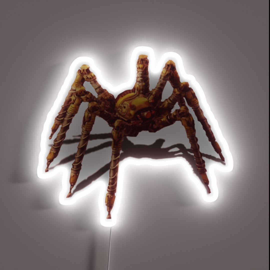 Customizable Spidertron-inspired RGB neon sign made from high-quality glass and electronic components, perfect for illuminating any Factorio-themed gaming space or enthusiast room.