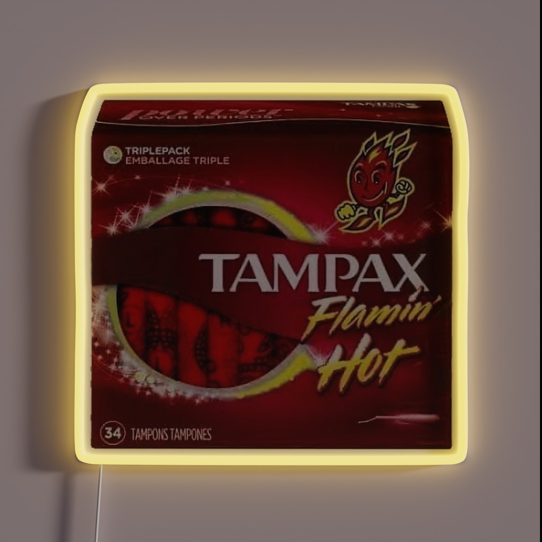 Brighten up your space with this eye-catching Flamin’ Hot Tampax RGB neon sign, a quirky conversation starter that’s as fiery as it is fun.