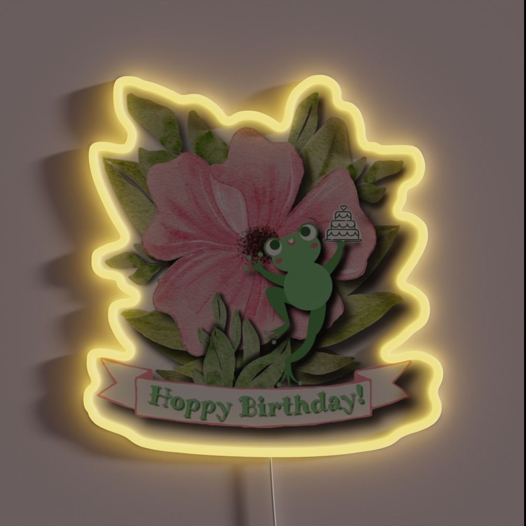 A vibrant and colorful RGB neon sign featuring a smiling frog saying ‘Hoppy Birthday’, adding a fun and whimsical touch to any party or special celebration.