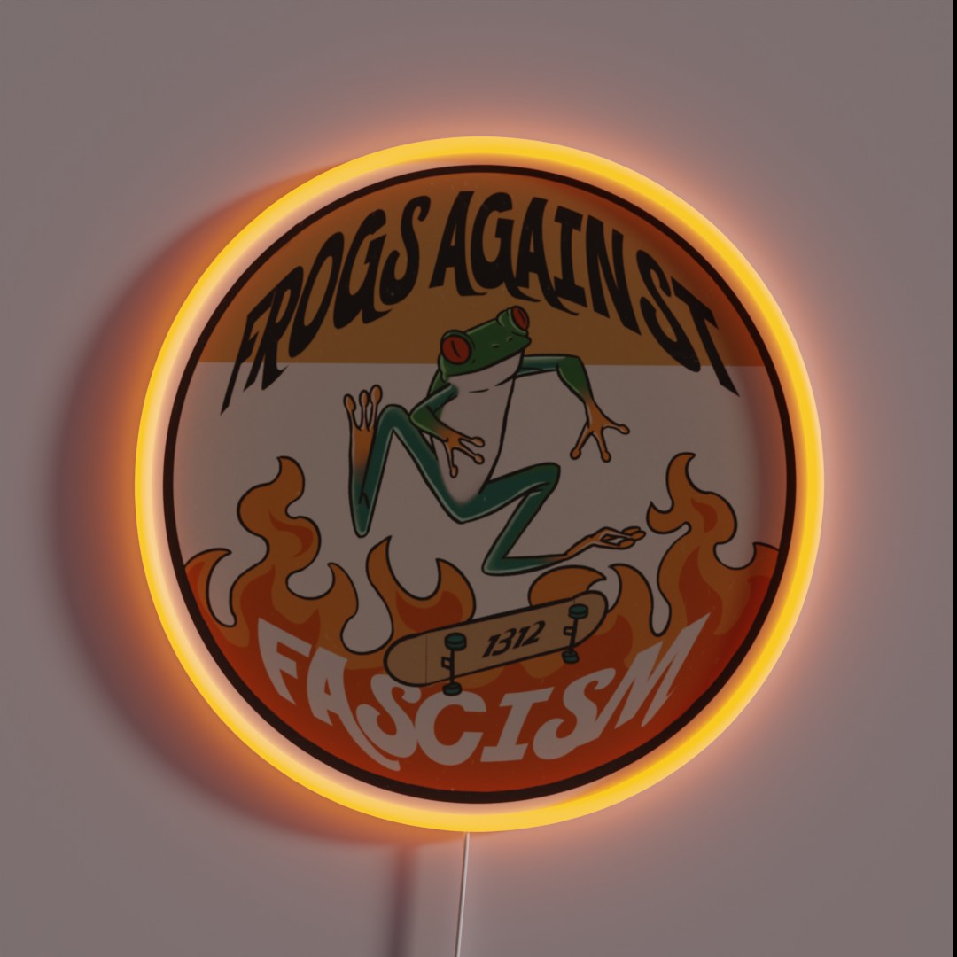 Make a bold statement with this vibrant ‘Frogs Against Fascism’ RGB neon sign, perfect for activists and free thinkers who want to express their values in style.