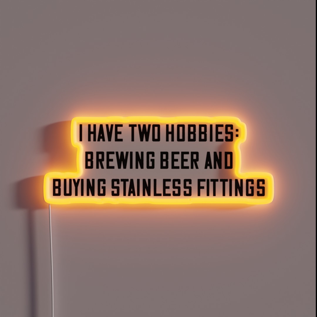 Add a touch of humor to your home bar or brewery with this customizable RGB neon sign featuring a hilarious design about beer brewing and collecting stainless fittings.