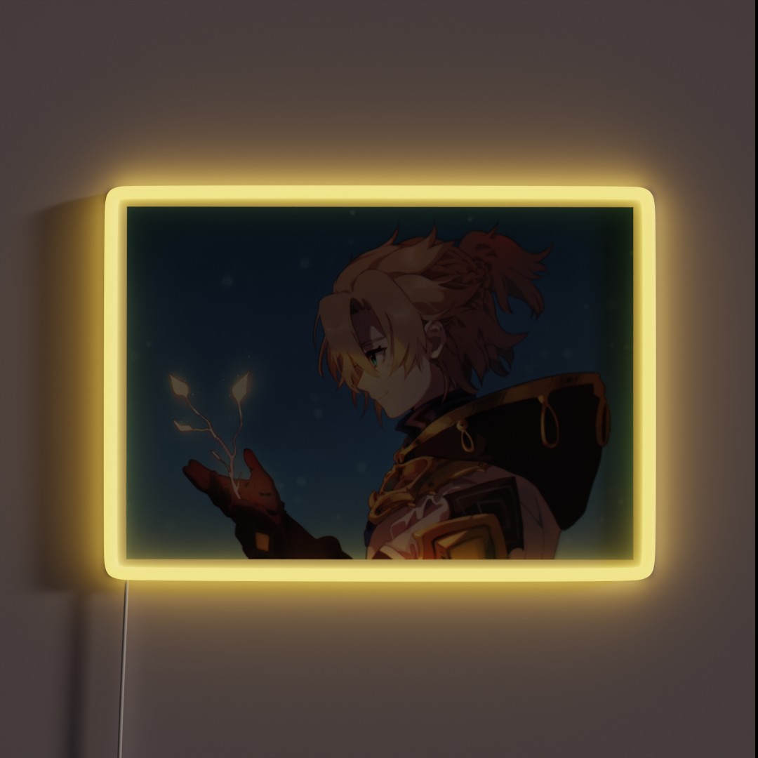 Dazzle your gaming space with this vibrant Albedo RGB neon sign, inspired by the enigmatic Vision from Genshin Impact. A stunning piece of fan art that brings a touch of Teyvat’s elegance to your room.