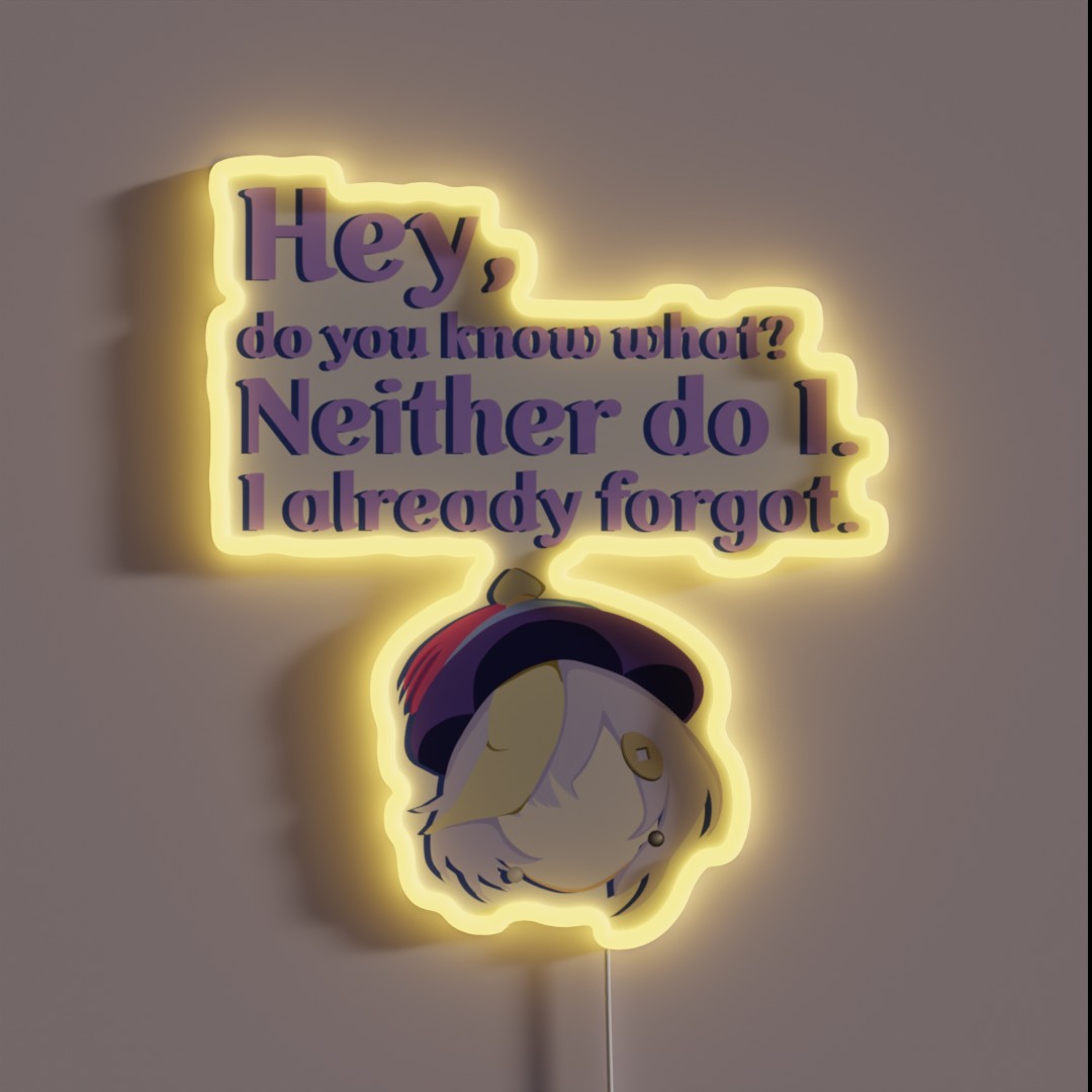 Bring a touch of whimsy to your space with our unique Qiqi Voiceline Hey do you know what Neither do I I already forgot RGB neon sign! This charming sign is inspired by the lovable character from Genshin Impact, adding a pop of color and personality to any room.