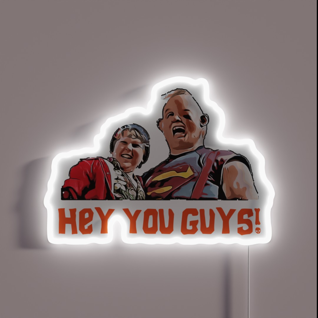 Get ready to channel your inner Goonie with this iconic “Hey You Guys” RGB neon sign! Inspired by the beloved 80s classic, this touchable and safe sign brings a nostalgic vibe to any room.