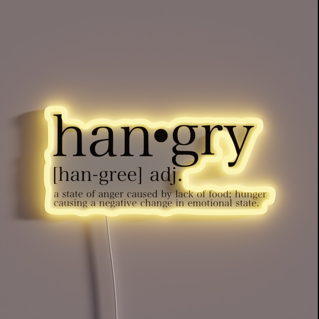 Indulge in your cravings with our vibrant Hangry RGB neon sign, illuminating your kitchen or office space with a humorous reminder to feed your hunger.