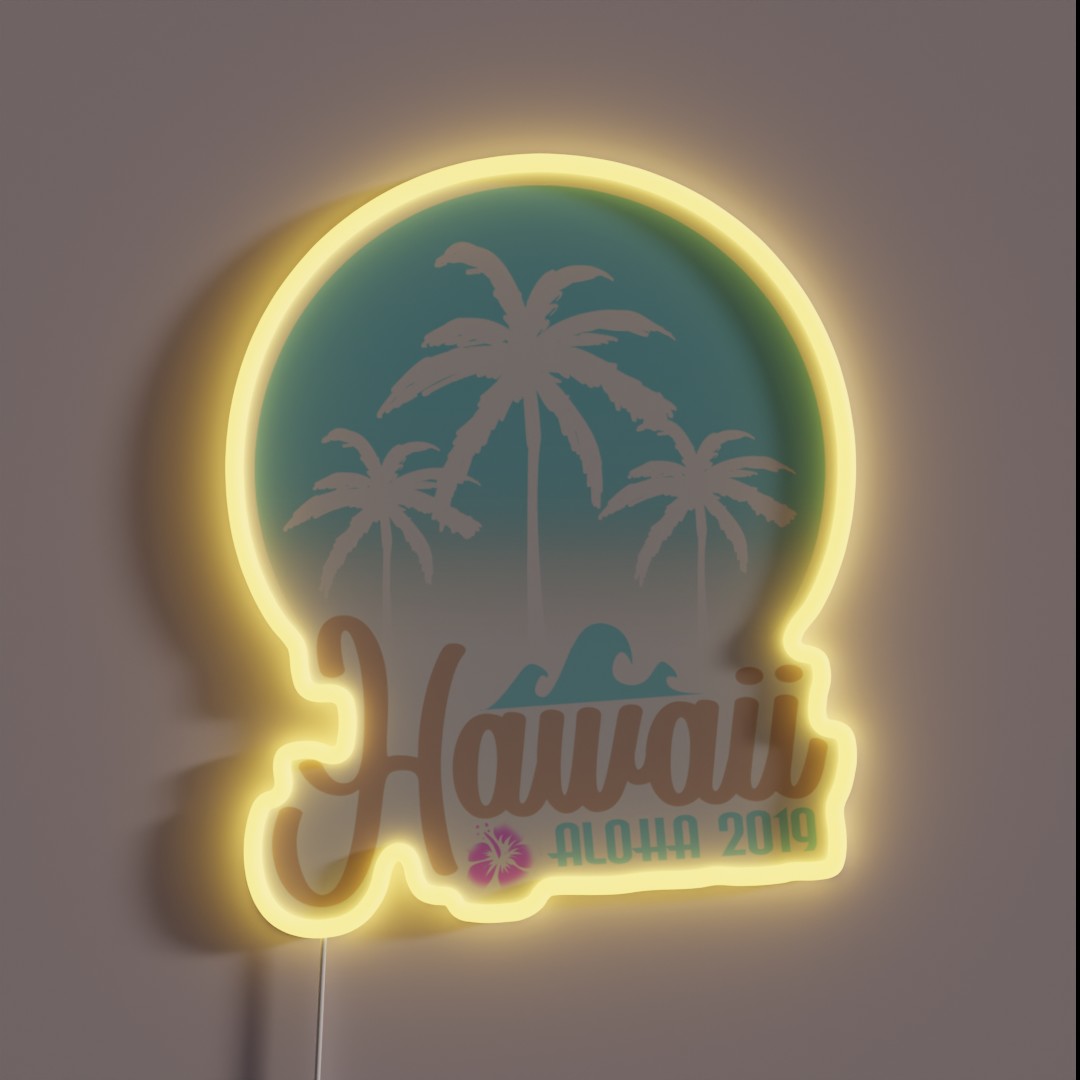 Add a touch of tropical paradise to your home with this vibrant Hawaii Aloha 2019 Holiday Palm Sign Design RGB Neon Sign, featuring colorful palm trees and festive holiday accents in radiant LED lighting.