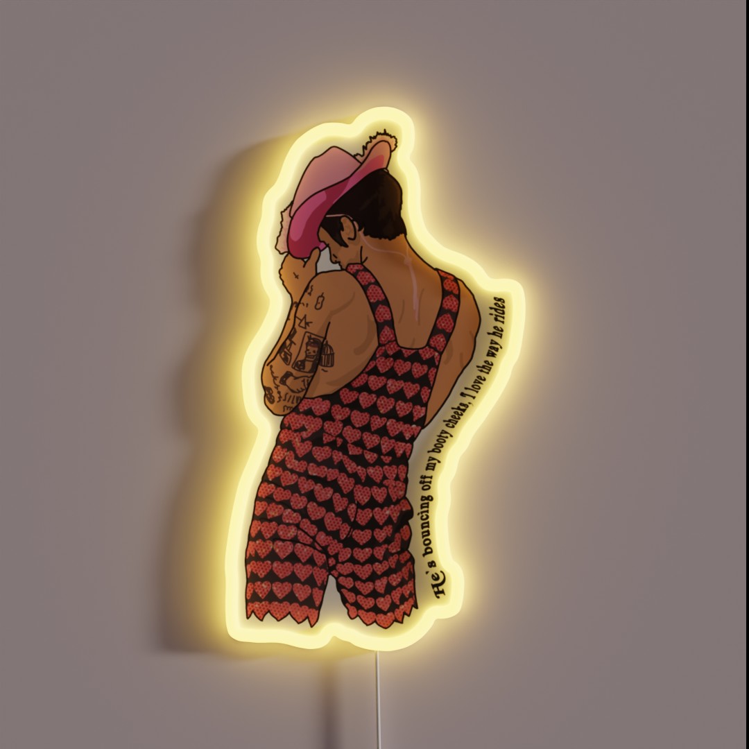 Add a pop of fun and sass to your space with this ‘He’s Bouncing Off My Booty Cheeks’ RGB neon sign, featuring vibrant neon lights that spell out a cheeky phrase in bold, eye-catching letters.