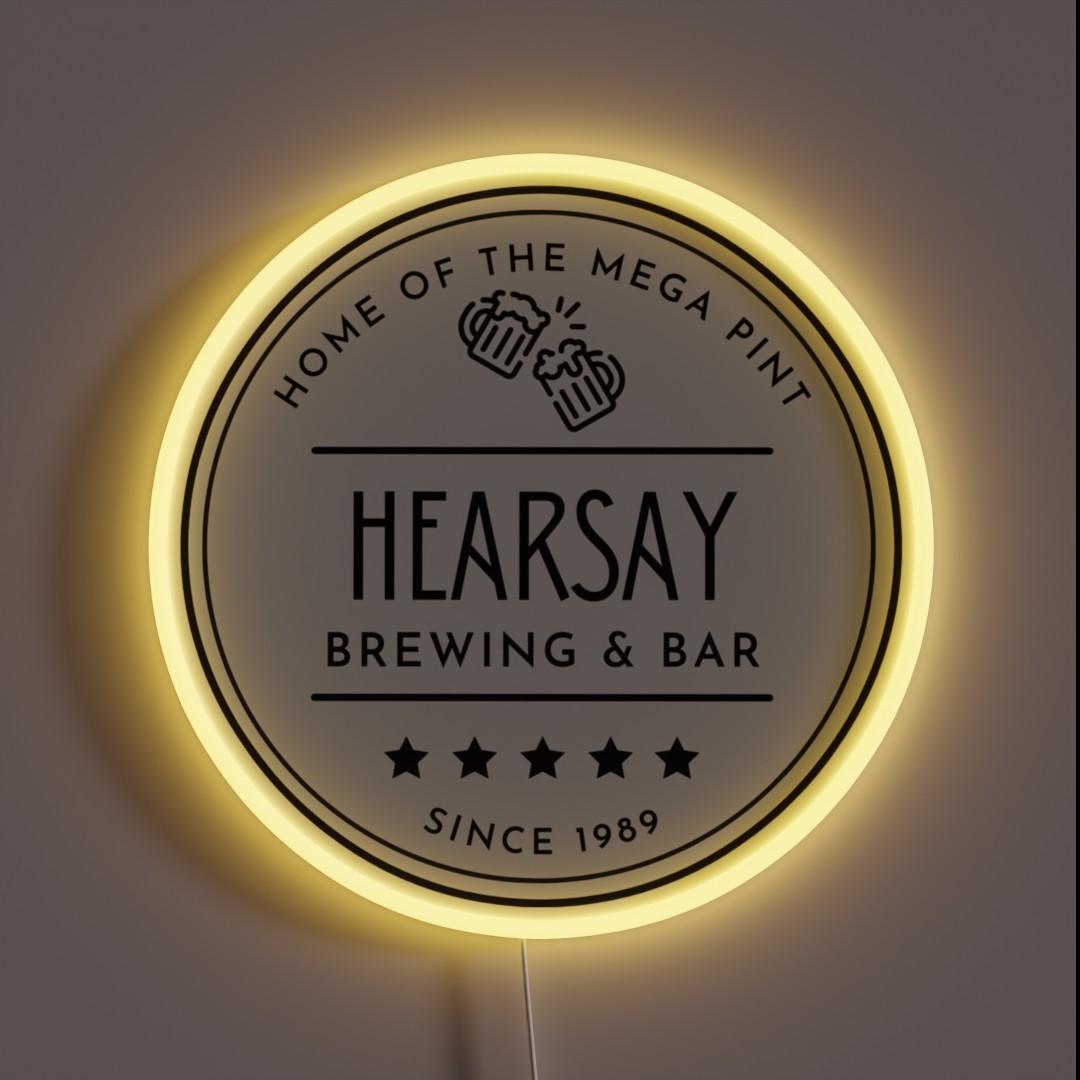Add a vibrant touch to your home bar or game room with this Hearsay Brewing and Bar RGB neon sign, featuring eye-catching colors that change in sync with your surroundings, making it a unique conversation starter for any beer enthusiast.