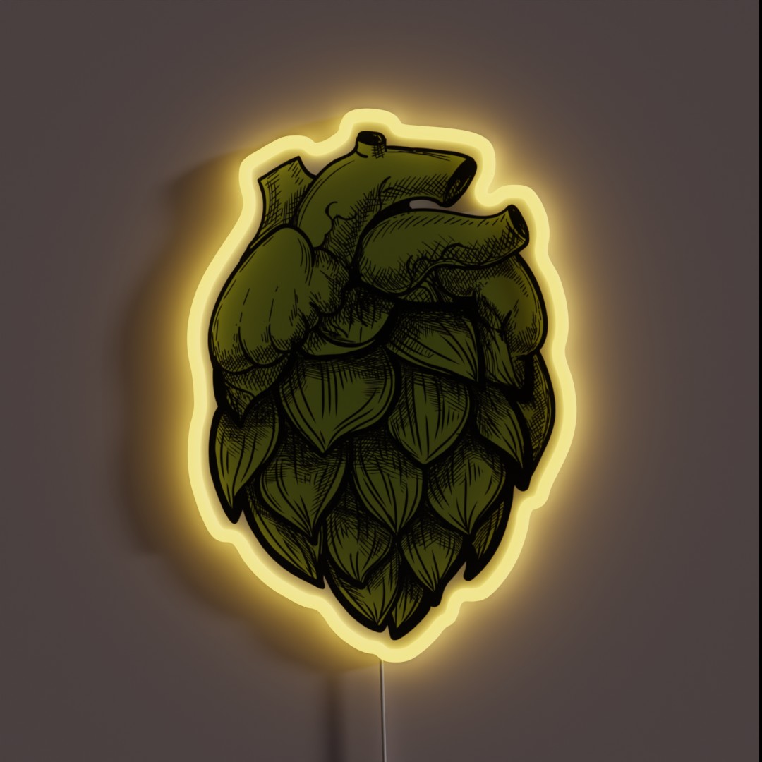 Add a touch of playful romance to your space with this vibrant Heart Shaped Hops green RGB neon sign, featuring a colorful heart surrounded by beer hops in stunning neon glow.