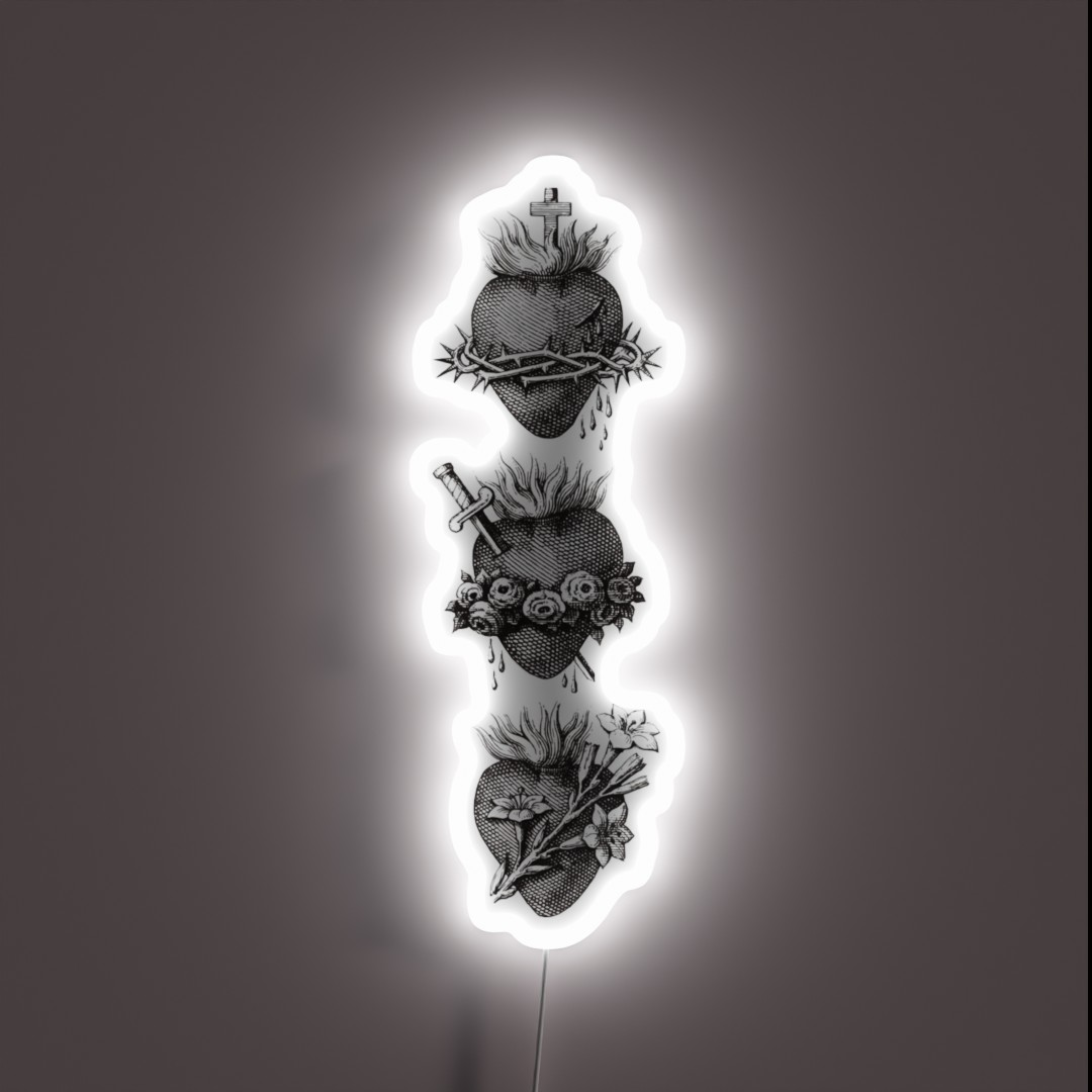 Bring a touch of divine love into your home or office with this stunning Hearts of the Holy Family RGB neon sign. Featuring a vibrant display of colorful hearts, this beautiful sign is not only eye-catching but also safe for use.