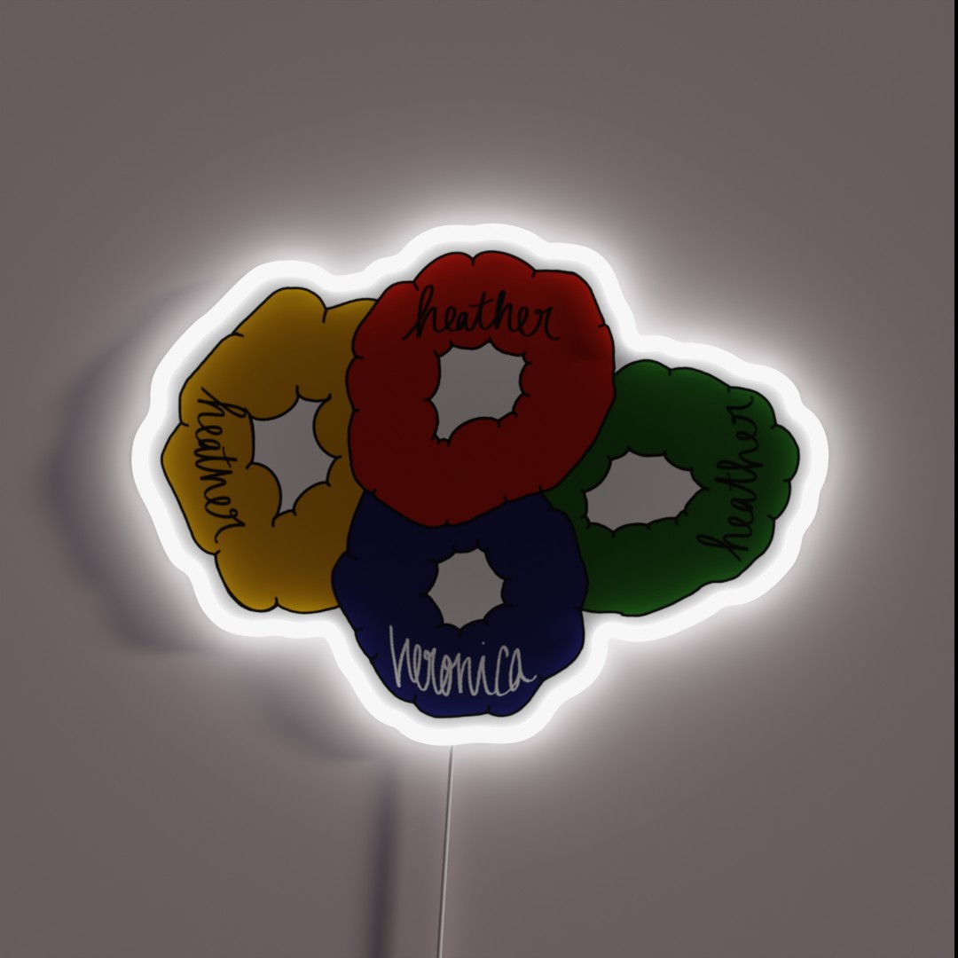 Add a pop of color and 90s nostalgia to any room with the Heathers Scrunchies RGB Neon Sign, a vibrant tribute to the iconic teen comedy.