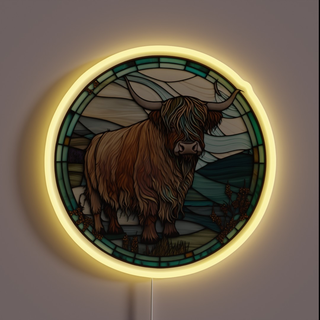 **Highland Cow from Scotland in Stained Glass Scottish Hairy Cow Longhorn RGB Neon Sign**