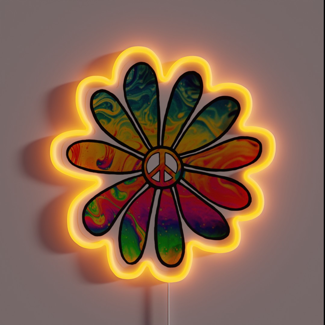 Add a groovy touch to your space with this vibrant psychedelic peace sign neon sign, featuring a colorful flower power design that embodies the spirit of hippie culture and free-spirited vibes.
