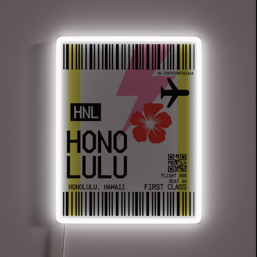 Add a touch of island vibes to your space with this vibrant Honolulu plane ticket RGB neon sign, perfect for travel enthusiasts and Hawaiian home decor.