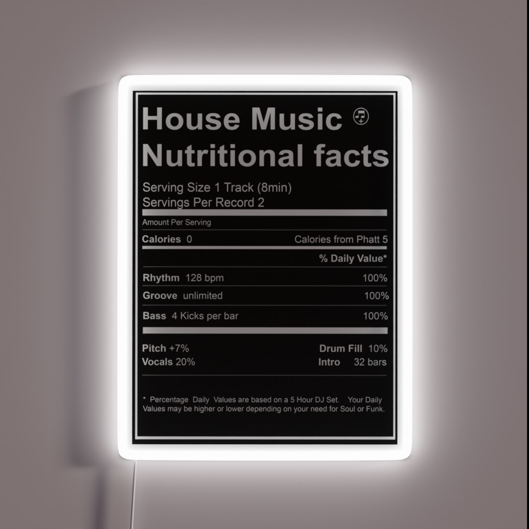 Add a vibrant splash of electronic music culture to your space with this eye-catching House Music Nutritional Facts RGB neon sign, featuring a humorous twist on nutritional labels with fun facts about beats and bass.