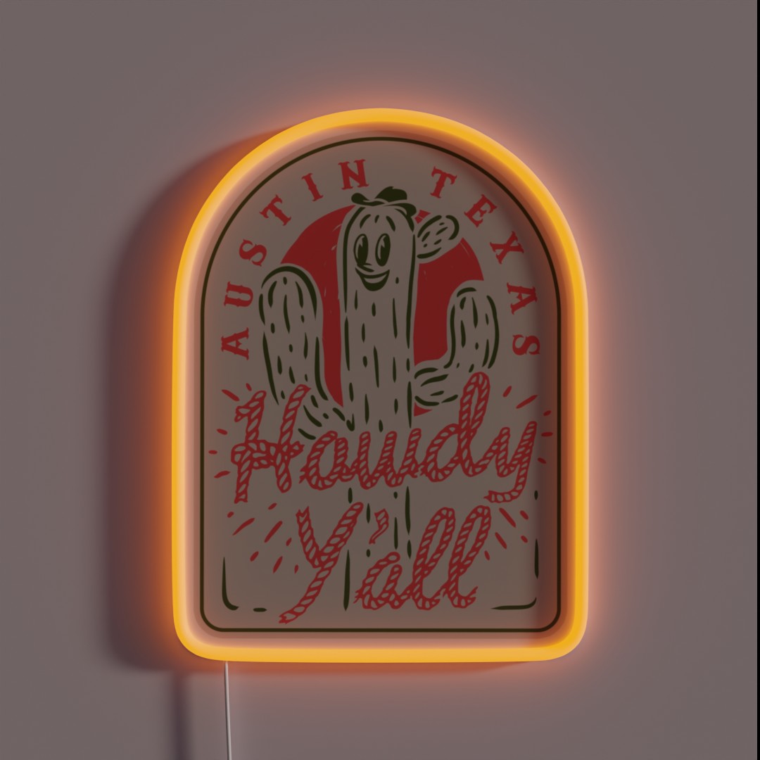 Introducing the HOWDY YALL Austin Texas Vintage Rope Text Green Cactus Smiling Prick and Retro Red Sun Tan Sand Background RGB neon sign! This unique piece of art is a perfect blend of retro charm and modern tech.