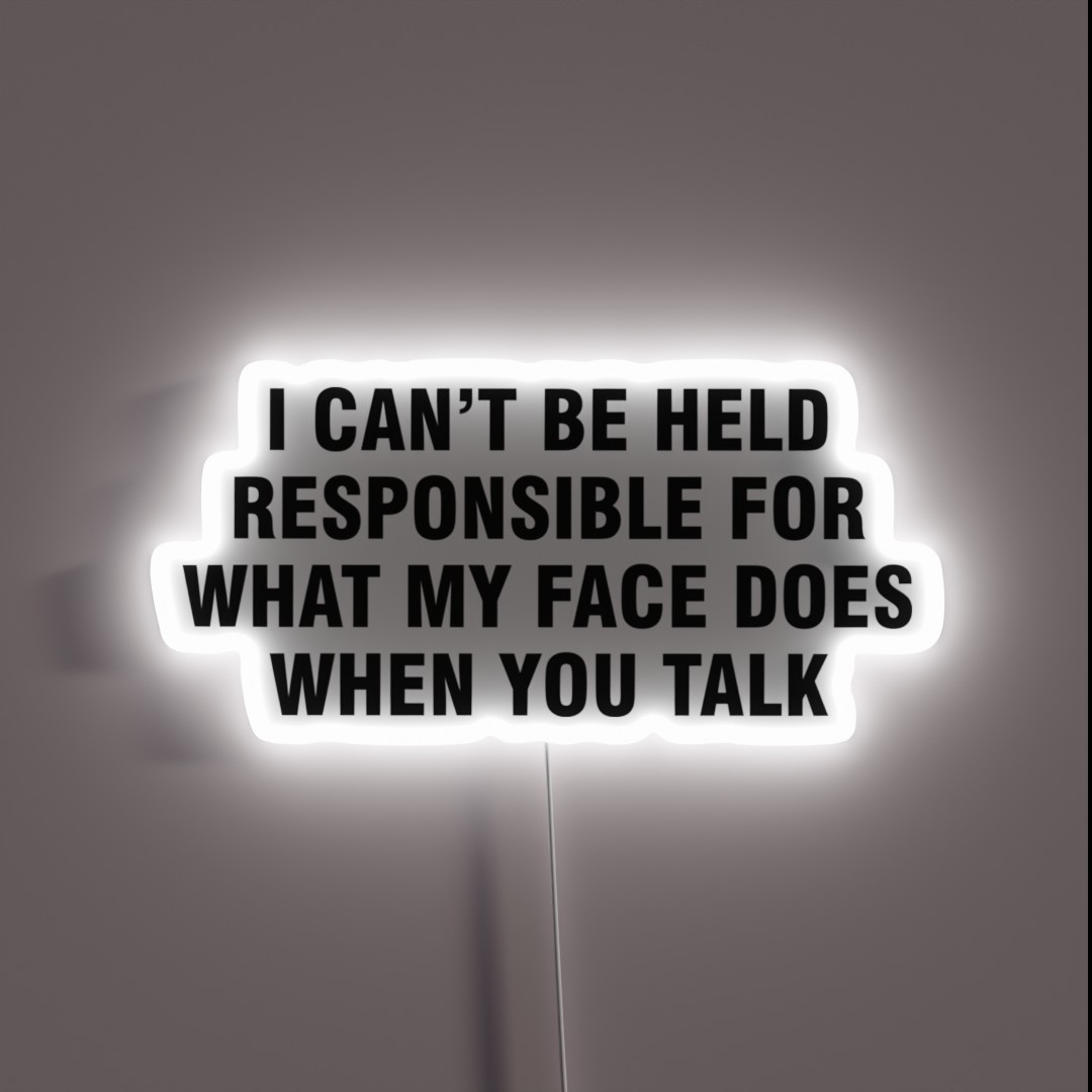 Express your sass with this cheeky ‘I can’t be held responsible for what my face does when you talk’ RGB neon sign, perfect for adding a humorous touch to any room.