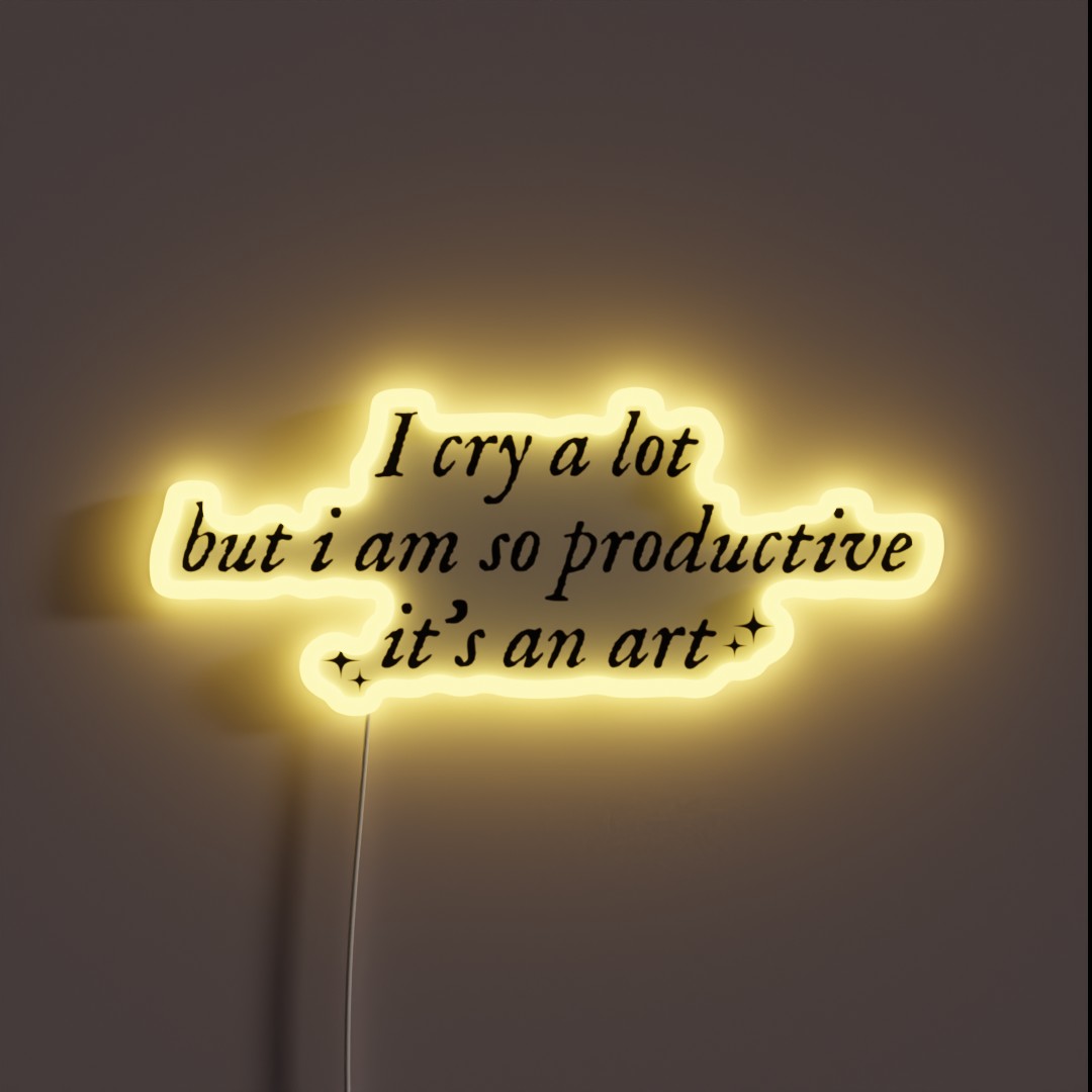 Are you a high achiever who wears their heart on their sleeve? Do tears of sadness coexist with triumphs in productivity? If so, this unique neon sign is for you! “I cry a lot but I am so productive” proudly displays your unapologetic authenticity.