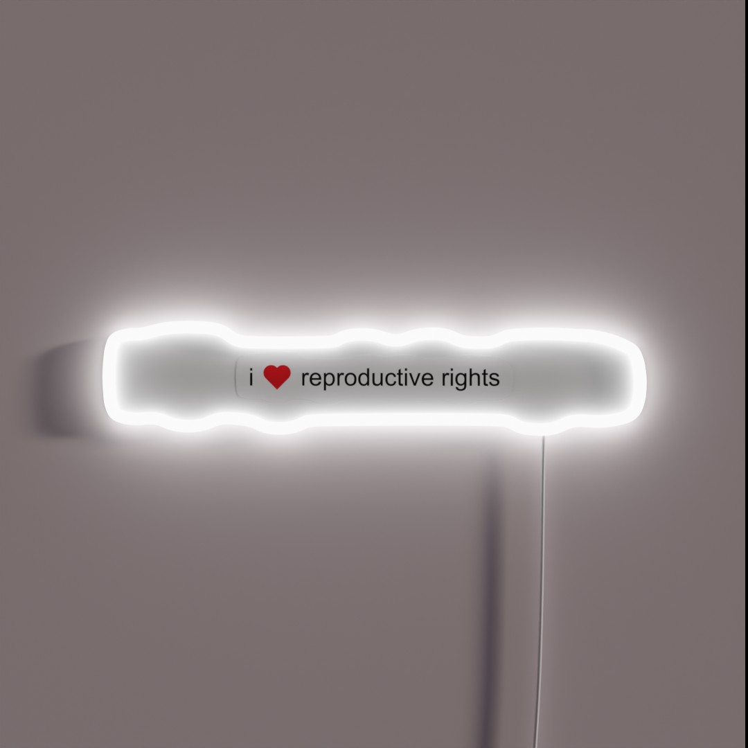 Illuminating reproductive freedom with bold, neon letters, this vibrant ‘I Reproductive Rights’ sign boldly declares support for bodily autonomy and choice.