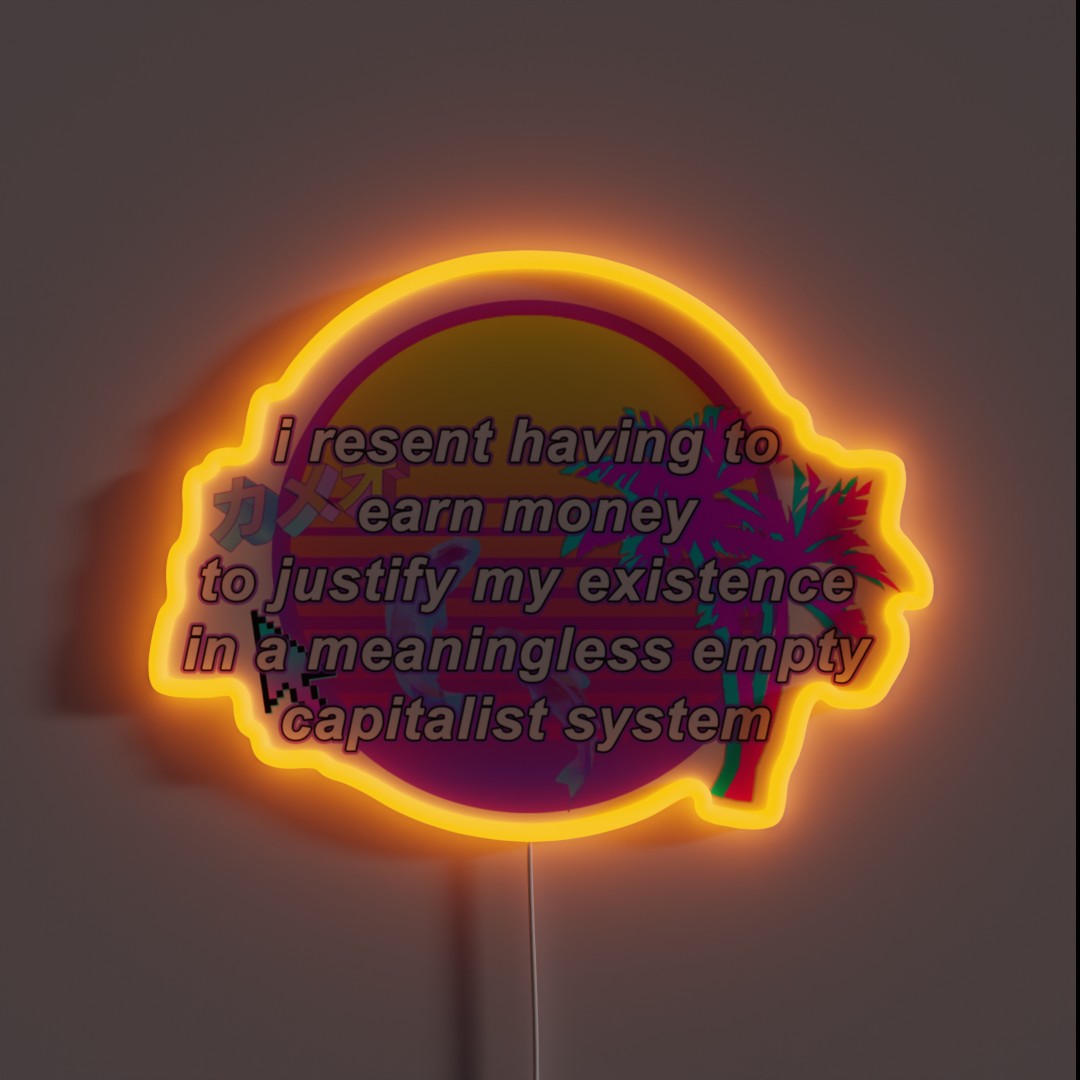 A bold statement for those disillusioned with the capitalist grind, this RGB neon sign proclaims “I resent having to earn money to justify my existence in a meaningless empty capitalist system”. Perfect for office cubicles, dorm rooms, or anywhere else you need a dose of existential dread.