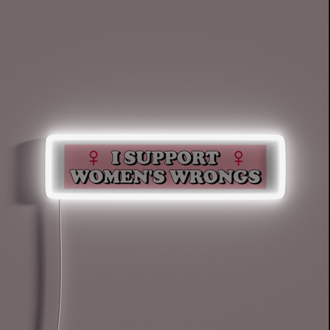 Ironic neon sign with sarcastic message: ‘I Support Women’s Wrongs’ – perfect for feminist humor and statement-making decor.