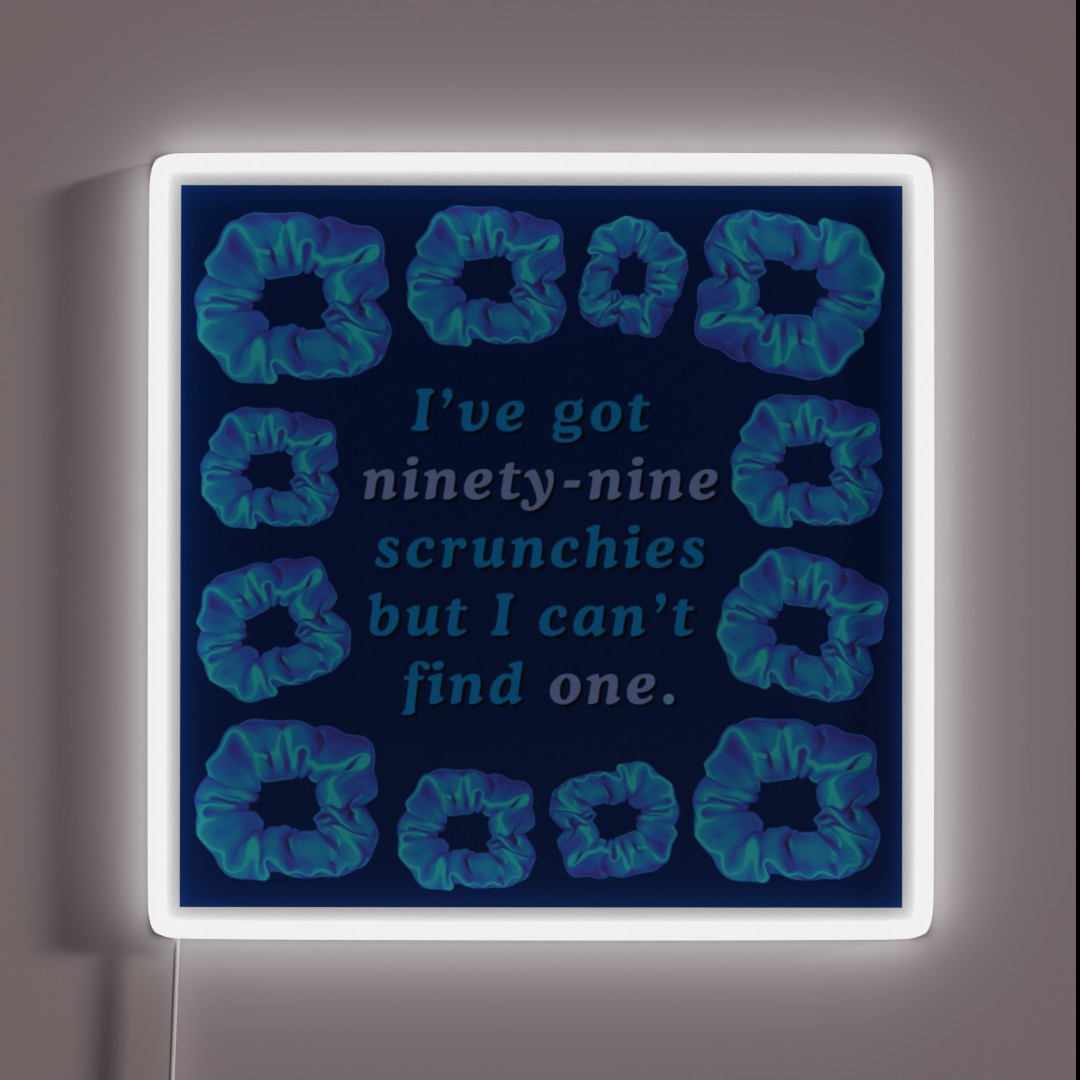 Nostalgic throwback meets modern flair with this retro-inspired ‘I’ve Got Ninety Nine Scrunchies But I Can’t Find One’ RGB neon sign, a humorous and eye-catching addition to any room.