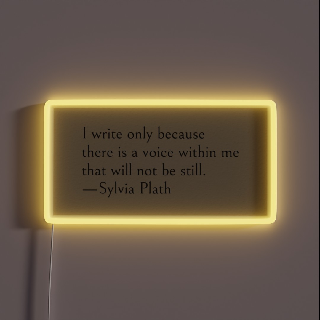 Illuminate your space with inspiration from renowned author Sylvia Plath, featuring her poignant quote ‘I write only because there is a voice within me that will not be still’ in bold RGB neon signage.