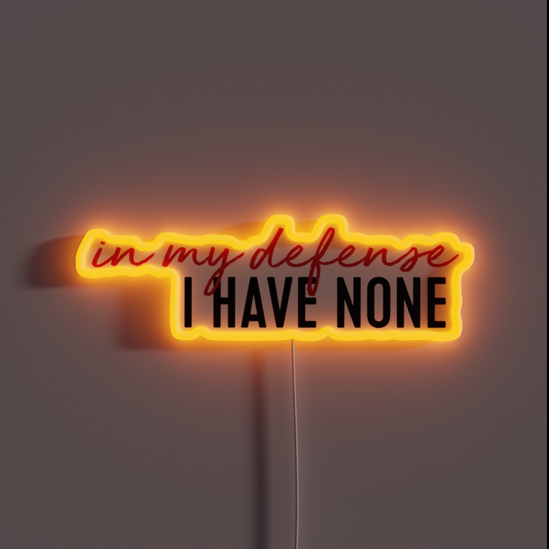 Add edgy flair to any room with our ‘In My Defense I Have None’ RGB neon sign, perfect for gamers and fans of humorously relatable phrases.