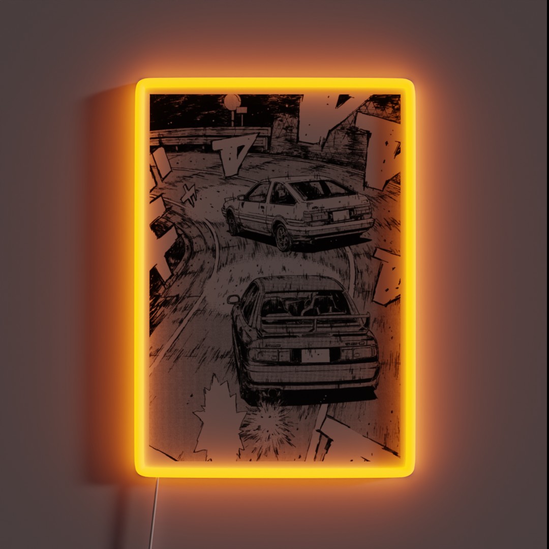 Officially licensed Initial D merchandise featuring an authentic manga-style panel showcasing the iconic battle between the AE86 and RX-7, now illuminated with vibrant RGB neon lights.