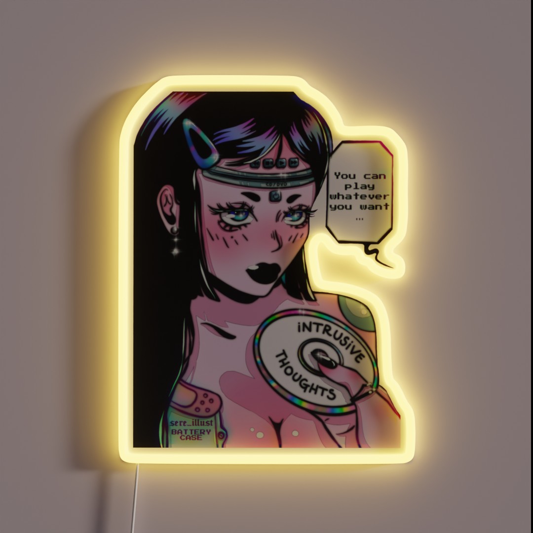 Add a touch of edgy lighting to your space with the Intrusive Thoughts RGB Neon Sign, a unique and eye-catching decoration that makes a statement about mental health awareness.