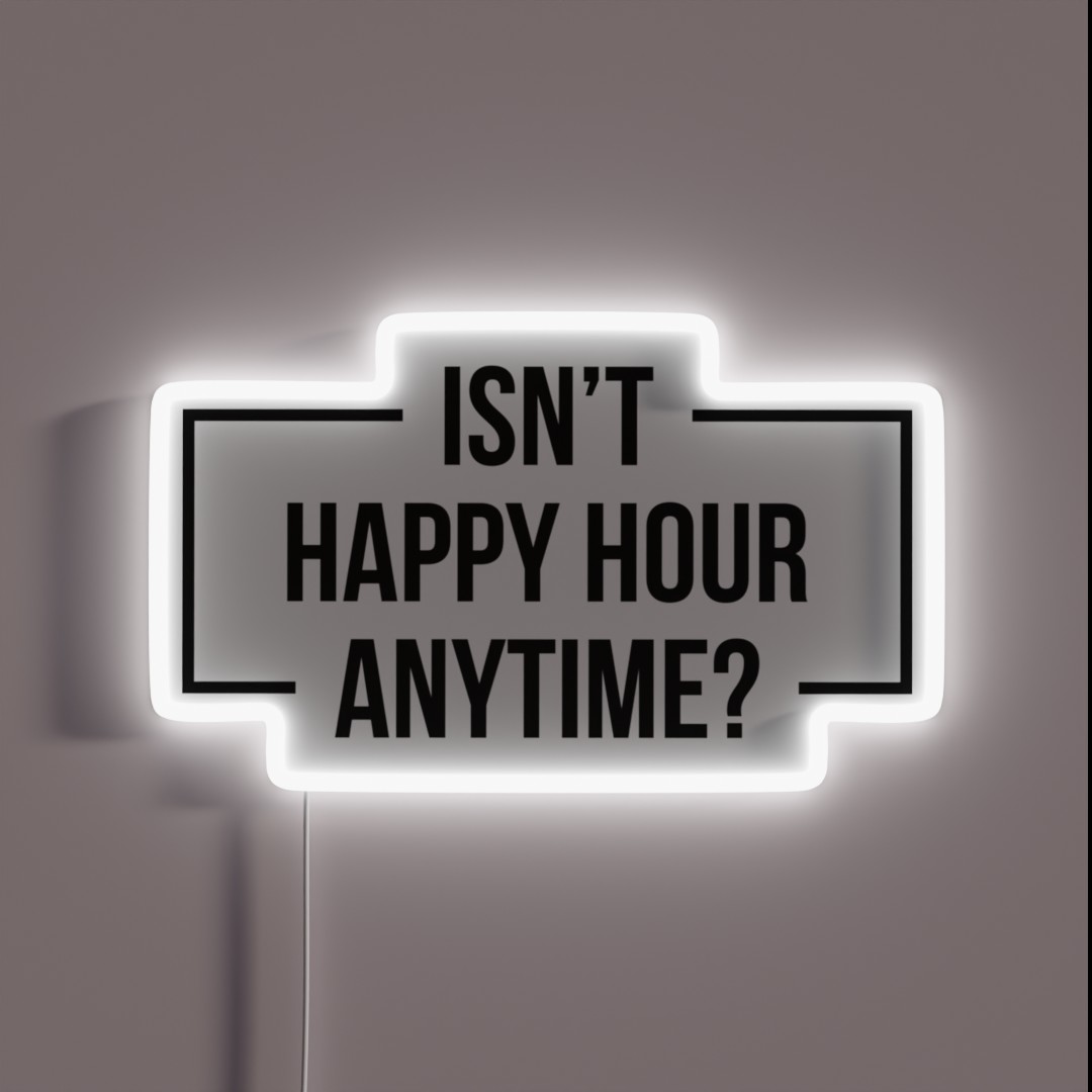 Bring the excitement of Happy Hour to your home or bar with our ‘Isn’t Happy Hour Anytime’ Version 2 Black RGB Neon Sign, featuring vibrant colors and a bold design.
