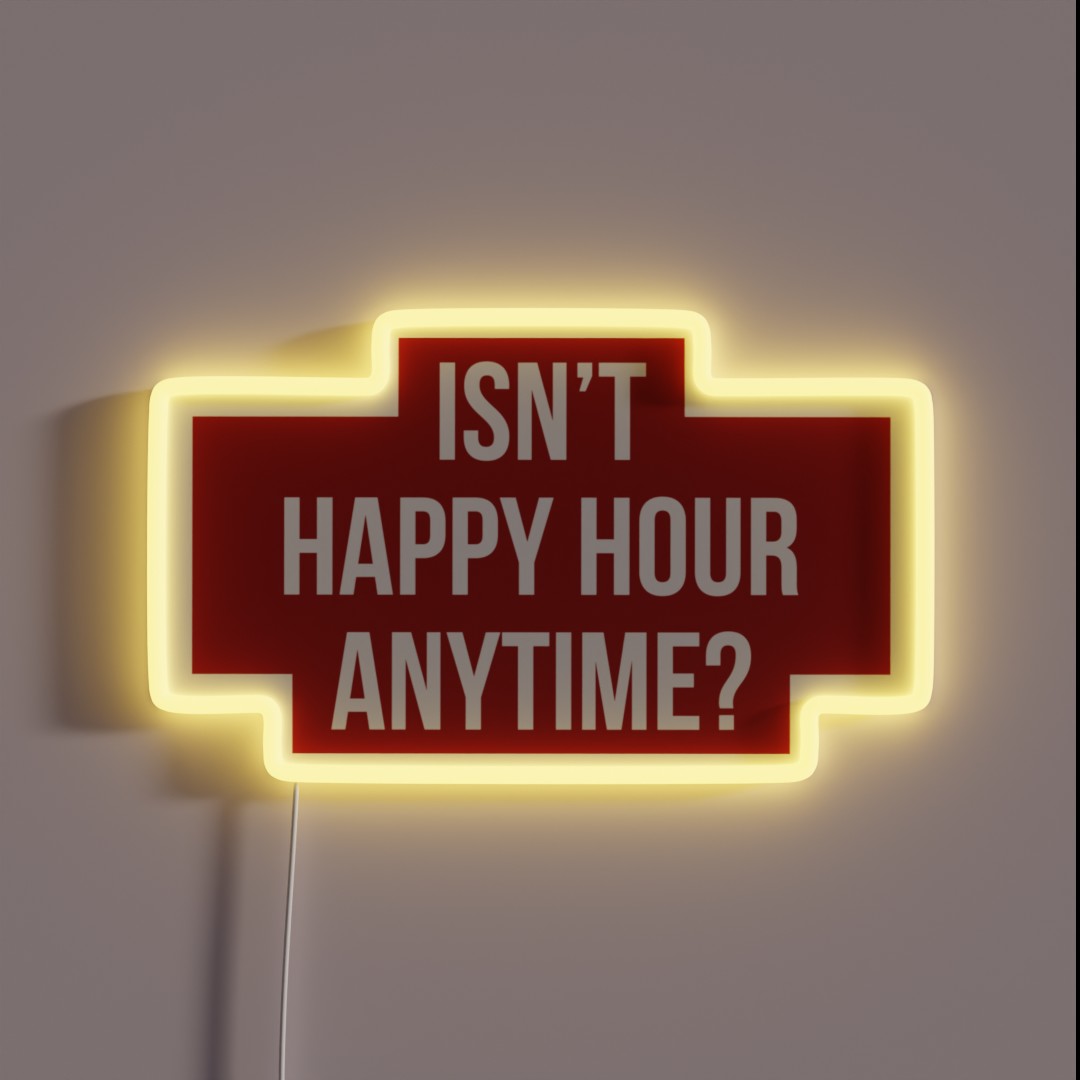 Vibrant ‘Isn’t Happy Hour Anytime’ neon sign with crisp white and bold red colors on a RGB background, perfect for adding a fun twist to your bar or home decor.