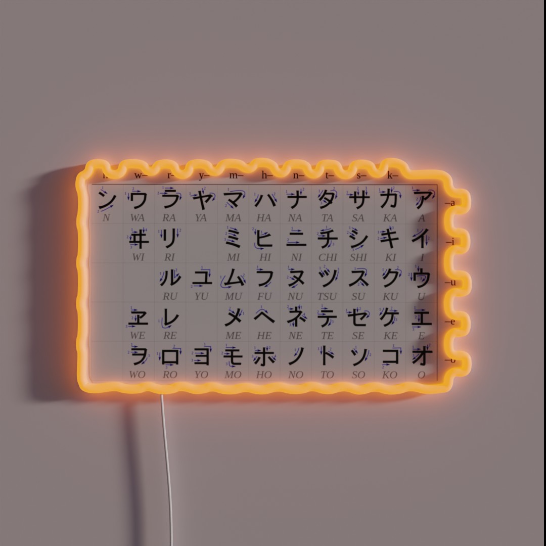 Illuminate your space with this vibrant RGB neon sign featuring the essential Japanese Katakana chart, perfect for language learners and enthusiasts to add a touch of East Asian flair.