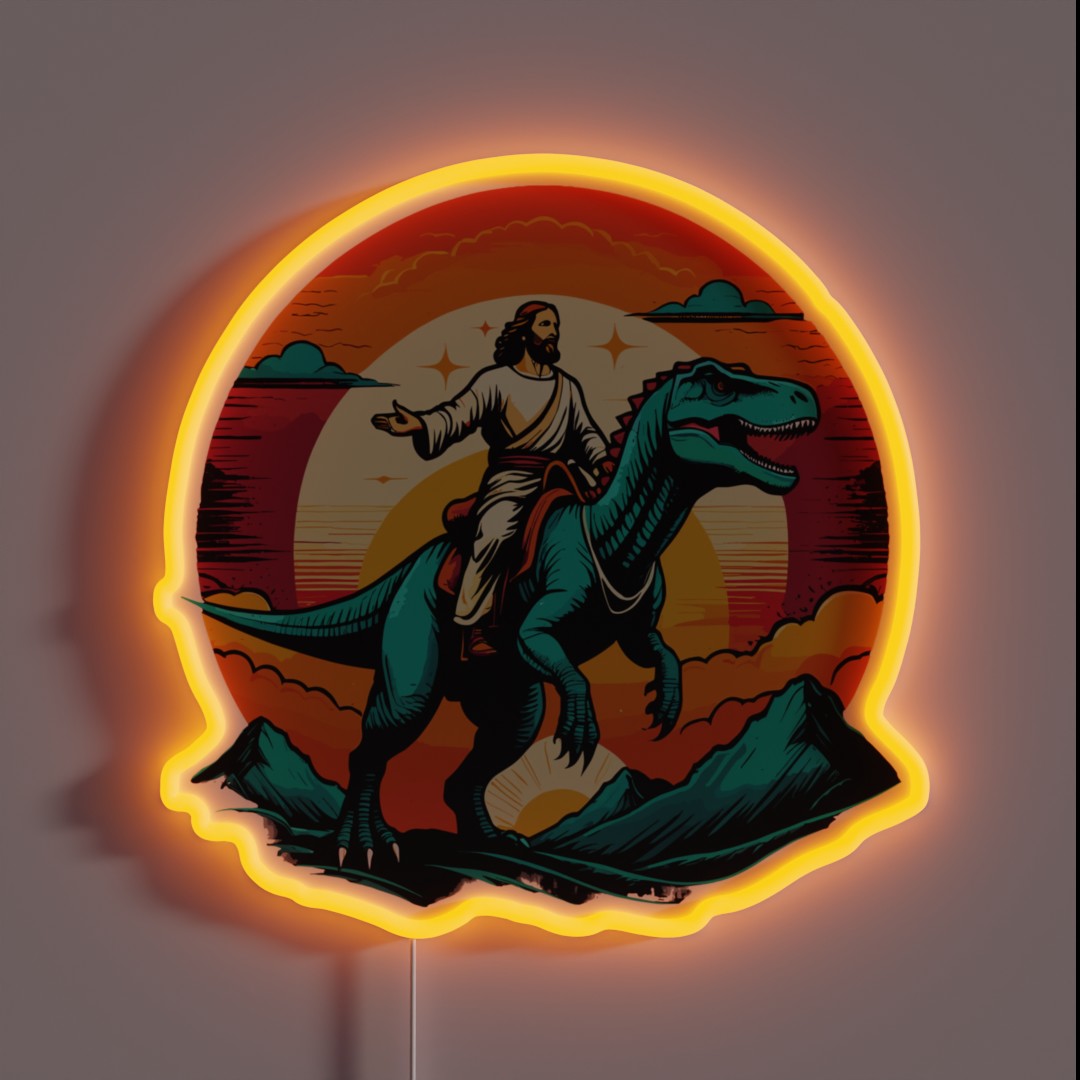Unleash the power of faith and prehistoric fun with this unique RGB neon sign featuring Jesus riding a majestic T-Rex in vibrant colors, perfect for any bedroom, office, or home decor.
