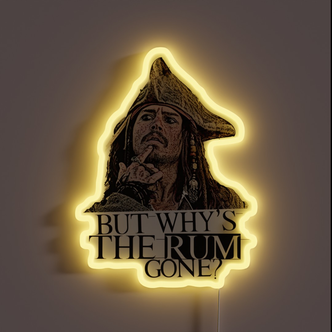 Add a touch of swashbuckling charm to your space with this vibrant Johnny Depp Pirates of the Caribbean themed RGB neon sign, featuring a clever twist on the classic ‘Why is the Rum Gone?’ phrase in bold, glow-in-the-dark letters.