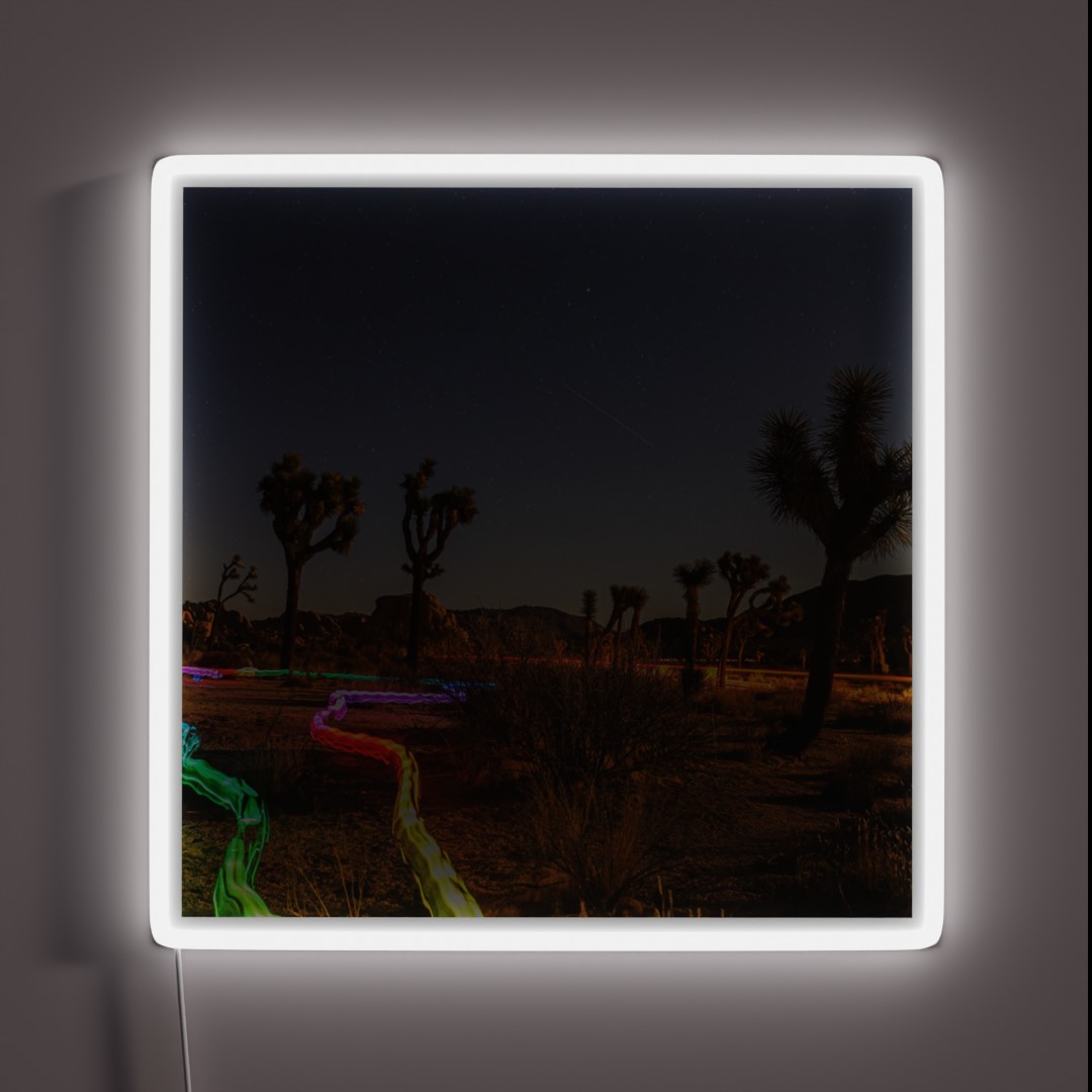 Illuminate your space with the breathtaking beauty of Joshua Tree under a vibrant rainbow of light trails. This unique and captivating sign is designed to transport you to the serene desert landscapes of California’s iconic national park.