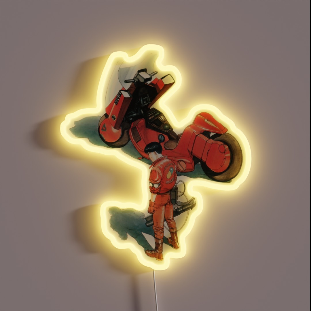 Add a touch of Akira-inspired style to your space with this vibrant Kaneda and his iconic bike RGB neon sign, featuring colorful LED lights that illuminate the classic motorcycle scene from the cult classic anime film.