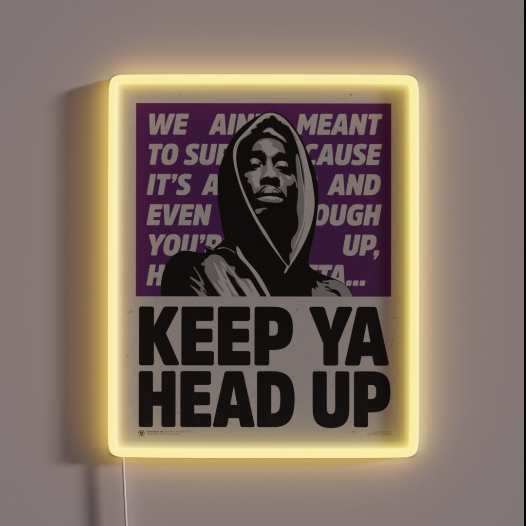 Add a touch of edgy elegance to your gaming setup or home decor with our ‘KEEP Y4 HE4D UP’ customizable RGB neon sign.