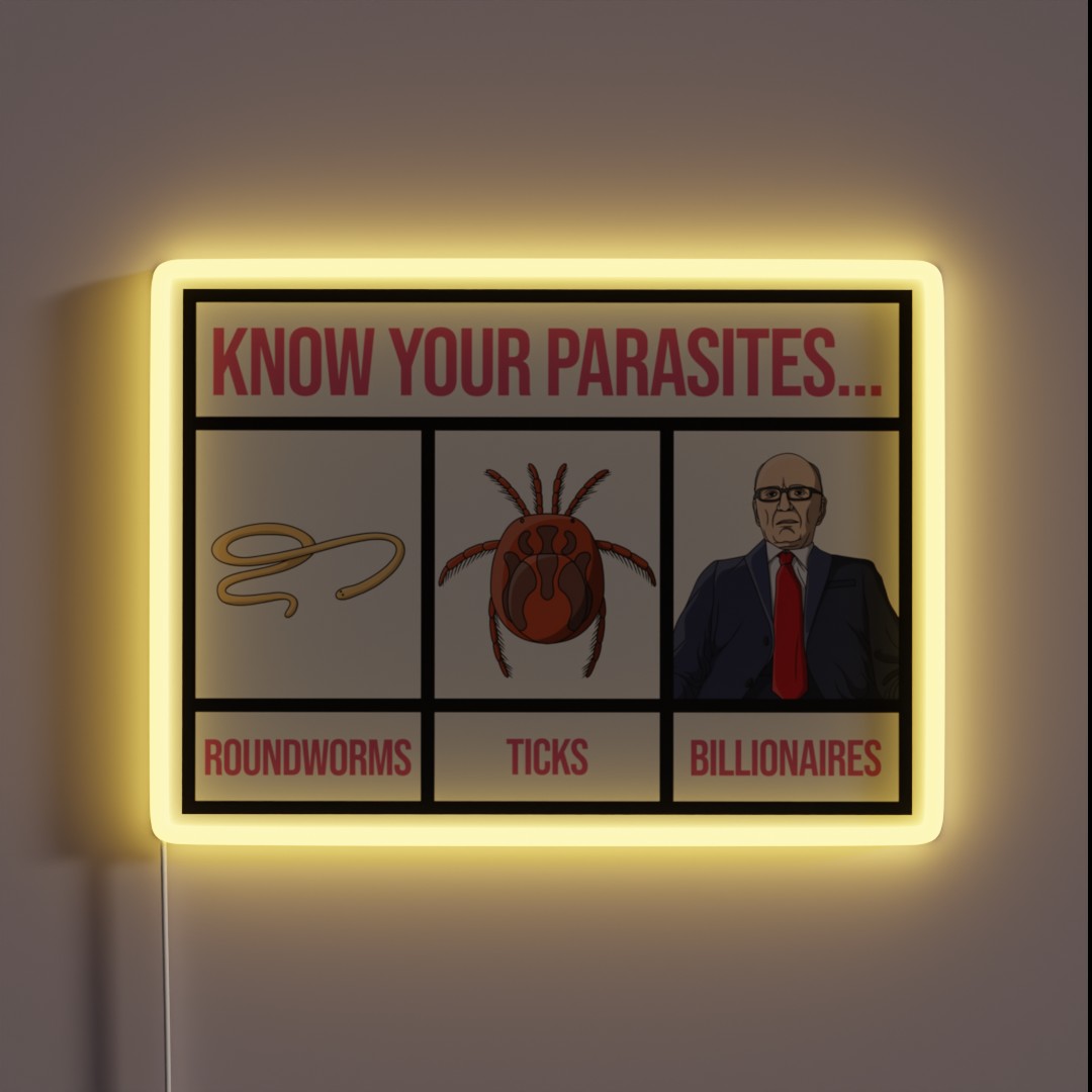 Know Your Parasites Anti Billionaire RGB neon sign – A provocative and eye-catching neon light statement piece that shines bright with a bold anti-billionaire message, perfect for those who dare to challenge the status quo.