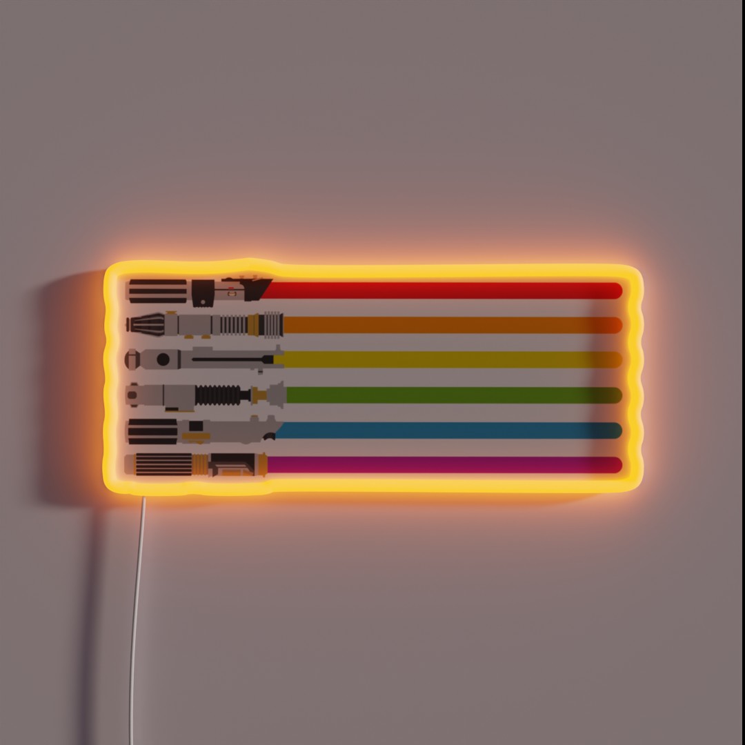 A vibrant, full-color LED neon sign that replicates the majestic glow of a lightsaber, featuring a mesmerizing rainbow RGB effect and a sleek, nostalgic design perfect for fans of Star Wars.
