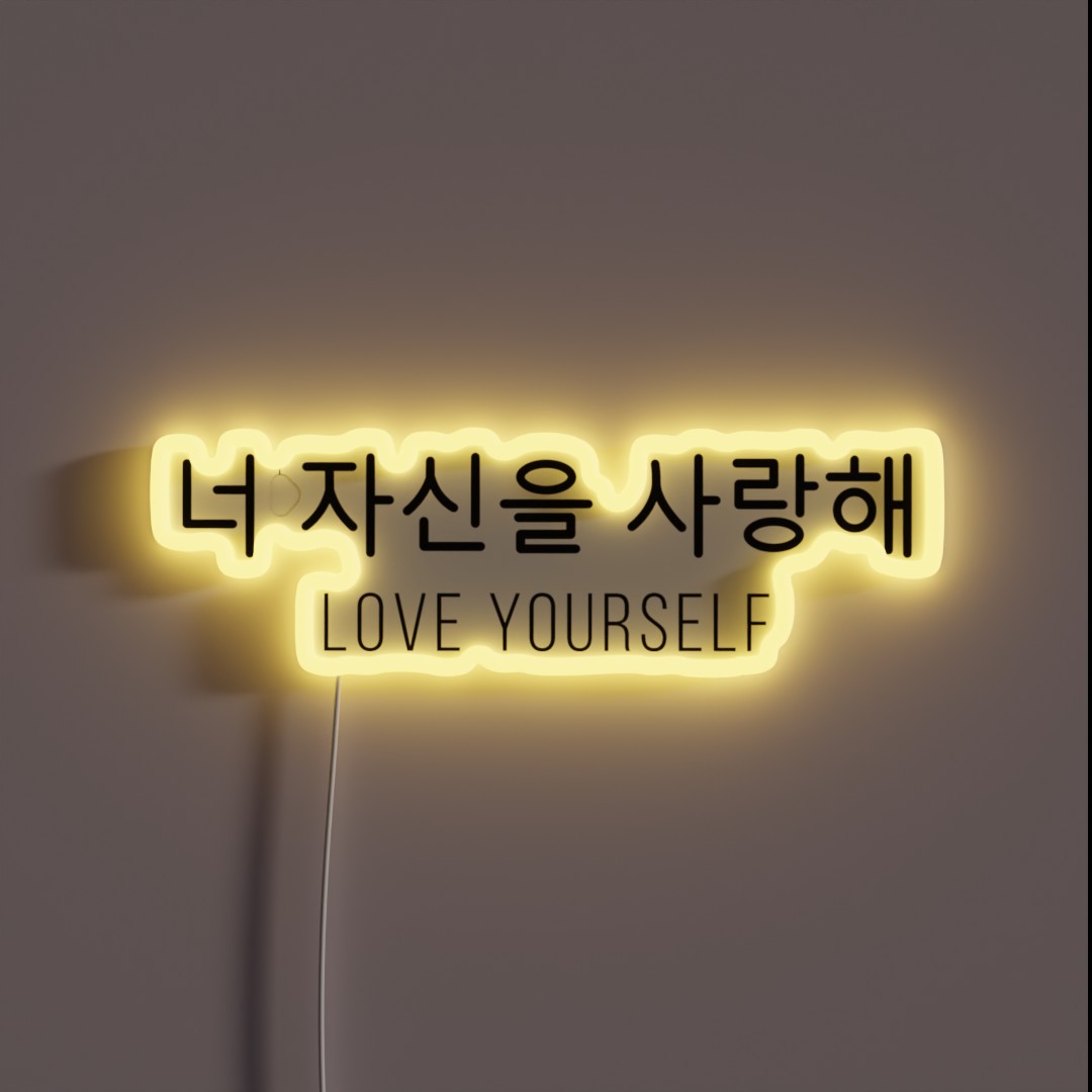 Show off your love and self-care with this vibrant ‘Love Yourself’ RGB neon sign in classic Korean font, perfect for modern decor and motivation.