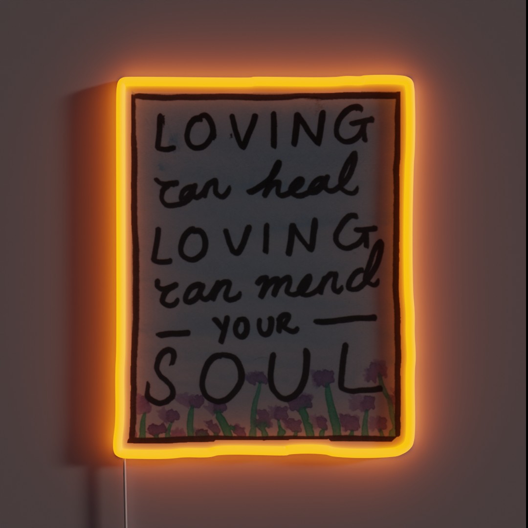 Add a touch of emotional depth to your space with this vibrant Loving Can Mend Your Soul RGB neon sign, perfect for those seeking positivity and self-healing inspiration.
